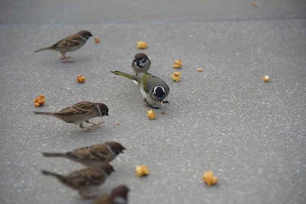 不小心掉落的爆米花,突然衝來一群麻雀搶食