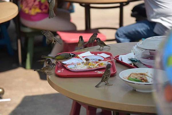 看到別桌吃剩的午餐,也是一堆小麻雀在搶食